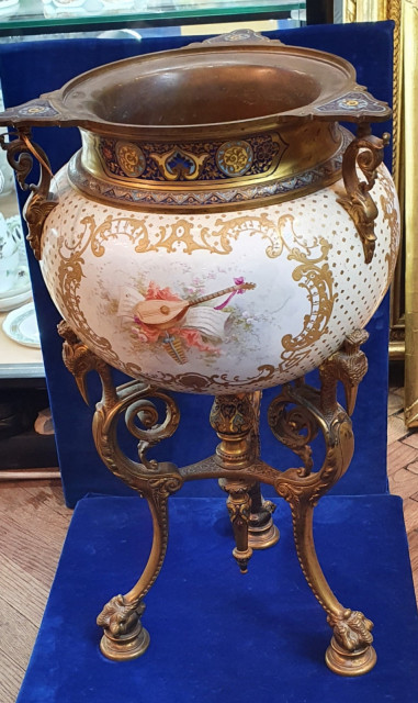 Sevres francia porcelán urna-illatosító tartó, oldalán angyalkás motívum, 4 oldala kézi festett, bronz lábakkal , lábain zománc ( cloisonne) berakással, m: 45 cm, urna száj: 18 cm, legszél .pont kb. 27 cm 19. század második fele Gyönyörű, dekoratív darab. Igazi ritkaság. |